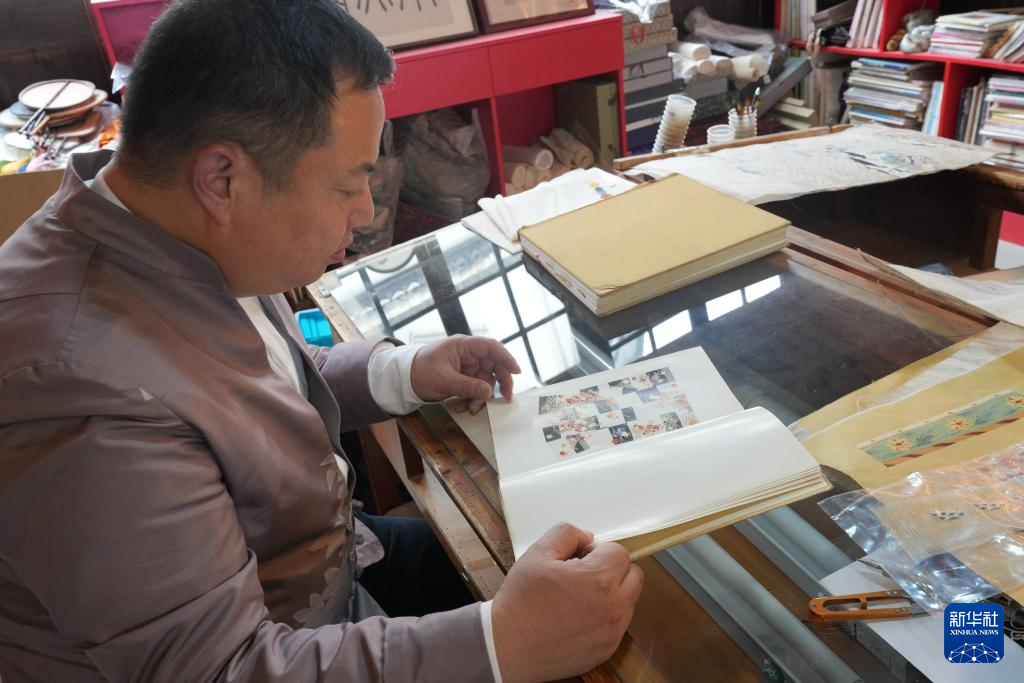 2月19日,柯翔祥在位于德清乾元镇的“缂金堂”内翻阅图册寻找灵感。