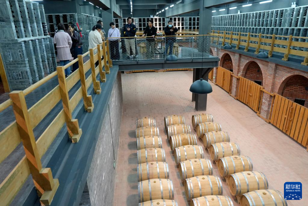 3月26日,参观者在大乐之野——夏多兰民宿葡萄酒窖了解葡萄酒窖藏知识。