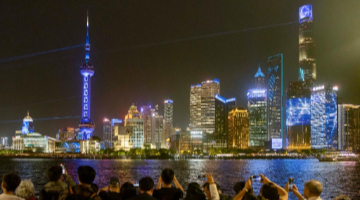 4月13日,在意大利米兰,参展嘉宾观看米兰设计周贵州工业设计城展区陈列的运用贵州蜡染工艺制作的牛仔裙。