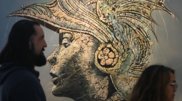 4月28日,观众在青岛电影博物馆老电影海报展区参观。