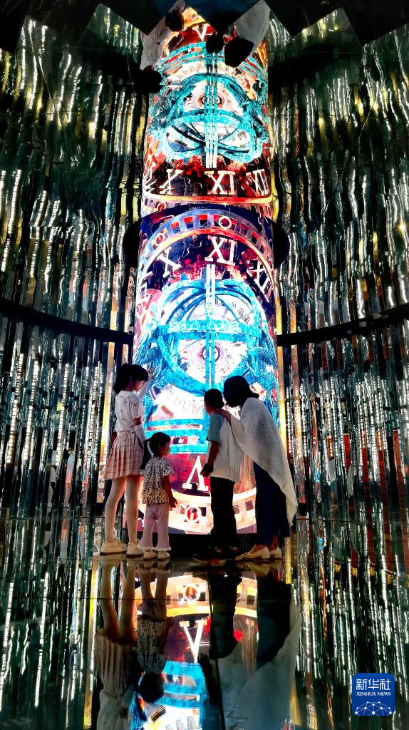 5月17日,游客在船山钟表博物馆内参观用3D全息投影技术展示的手表内部构造。