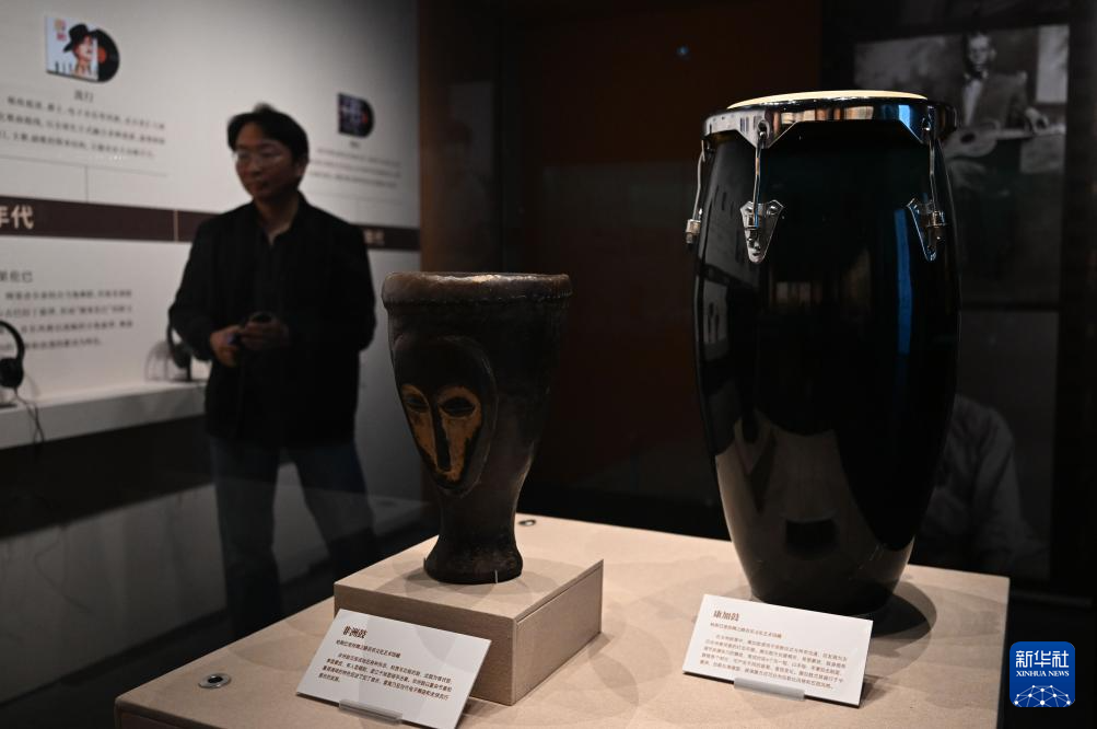 11月29日,参观者观看现场展出的非洲鼓、康加鼓。