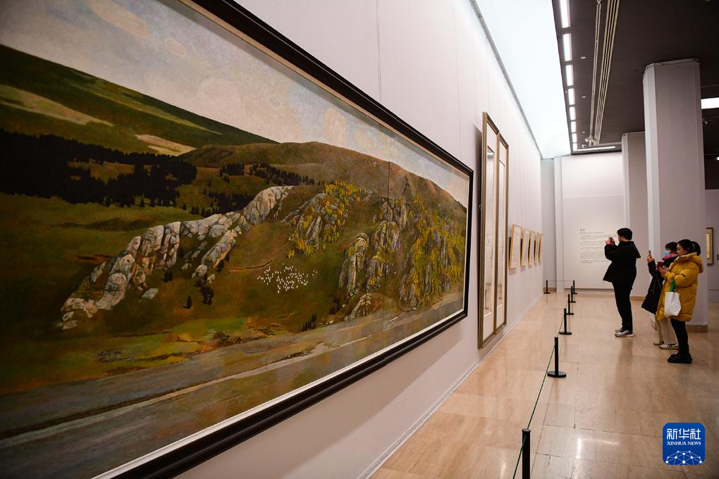 1月7日,观众在中国美术馆观看展出的阴山岩画主题绘画作品。
