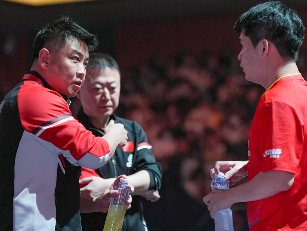 11月30日,中国队教练王皓(左)在男单比赛中指导林诗栋。新华社记者 王曦 摄