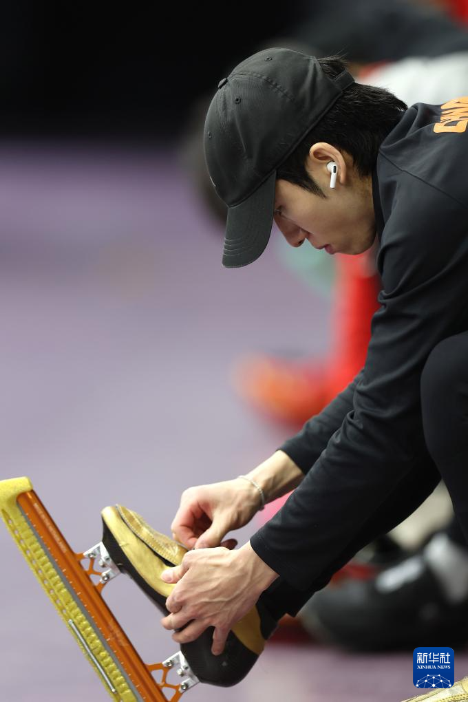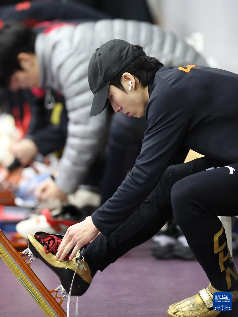 1月29日,中国短道速滑队选手林孝埈在训练前穿上冰刀鞋。