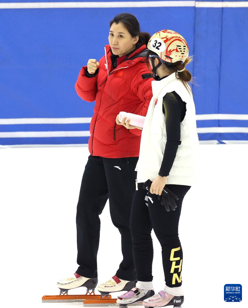 1月29日,中国短道速滑队教练张晶(左)在训练中为队员杨婧茹加油。