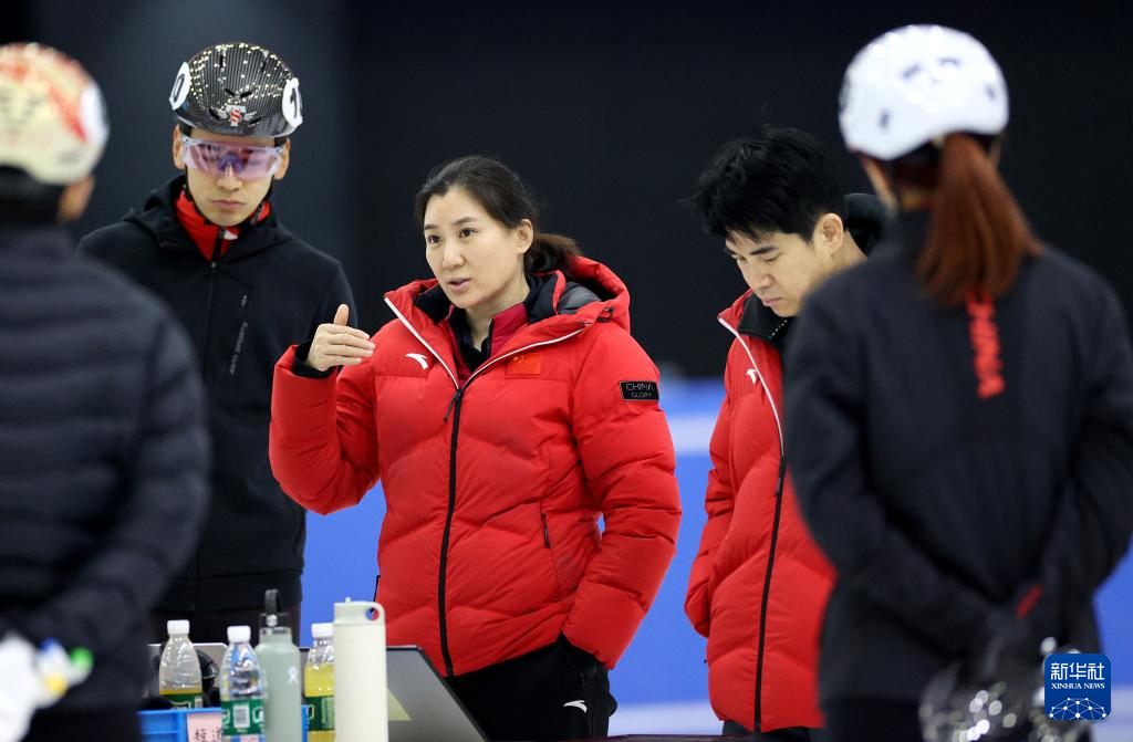 1月29日,中国短道速滑队教练张晶(中)在训练中指导队员。