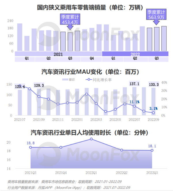 今年三季度,众多造车新势力持续发力,多款新车型的上市合力拉动汽车消费需求。第三季度汽车零售累计销量为563.9万,同比增加了24.1%,环比上季度增加了29.9% 。行业月活跃用户规模稳定在1.3亿,同比增长曲线有所放缓,但仍然保持正增长态势。