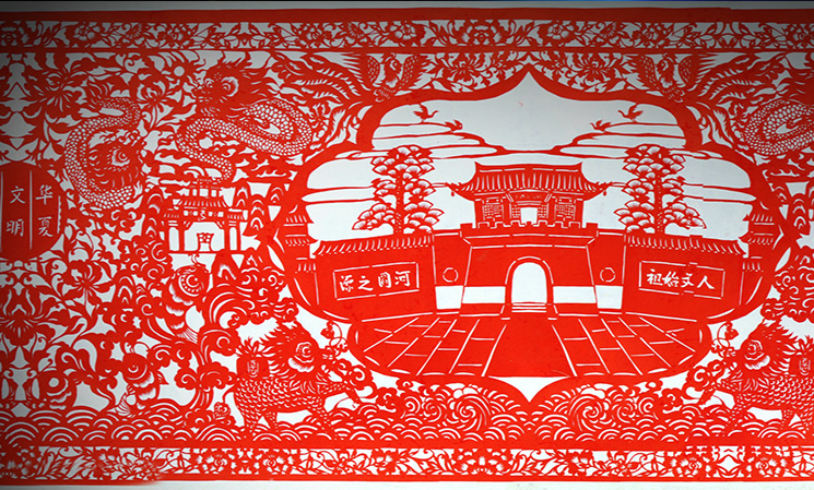 于是我決定回家專門剪紙,但是我父母認為鉸花都是老婆婆們閑著沒事做的事,你一個男孩子還是應(yīng)該好好賺錢。就這樣我跟父母僵持了很久,但最后還是我拗著性子從外邊回到了我們農(nóng)村老家,開始尋找會剪紙的老人,去記錄、去詢問、學習我們地區(qū)傳統(tǒng)的剪紙民俗知識。因為現(xiàn)在像剪紙這個藝術(shù),在我們的地區(qū)還僅是一些老人出自一些喜好去剪、去做,但隨著這些老人的去世,這些作品也就會隨著一把火被燒掉。我希望我能把這些東西都保留下來,我希望有更多的人去了解我們地區(qū)的剪紙文化,所以我就下決心收集這些剪紙的資料,去申報非物質(zhì)文化遺產(chǎn)名錄。想要申報還要去做很多的事情,一是去尋找這些傳世的老作品,另外就是要擴大孟津剪紙的影響力,參加各種比賽去獲獎。那時我白天去尋找老藝人,晚上就自己在屋里埋頭創(chuàng)作,每天晚上都會剪到凌晨一點多。我媽本來是反對的,但是當她看到每晚我都會剪到很晚,她就明白了我是真心喜歡這個事兒,就慢慢地開始心疼我。后來她也幫助我開始粘貼,像我剪的《都說我孟津好風光》,這個作品長13米,沒有那么長的紙,我們就一起粘貼?;巳齻€多月剪完,家里邊沒有那么大粘貼裝裱的空間,我父母就站在我們家院子的平房頂上一起把它鋪開,一個一個地粘起來裱好。