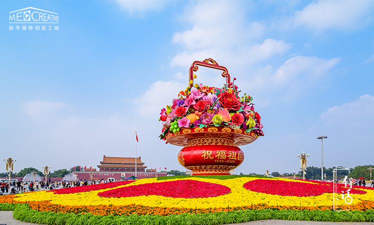 我們在天安門廣場中心布置了“祝福祖國”的巨型花果籃?;@內(nèi)的一千朵花、一百只果匯聚成一句話就是:祝福祖國繁榮昌盛,祝福人民幸福安康。底花壇的十個紅心圖案象征著全國人民心心相印,團結(jié)一致,為實現(xiàn)中華民族偉大復(fù)興的“中國夢”而努力奮斗。