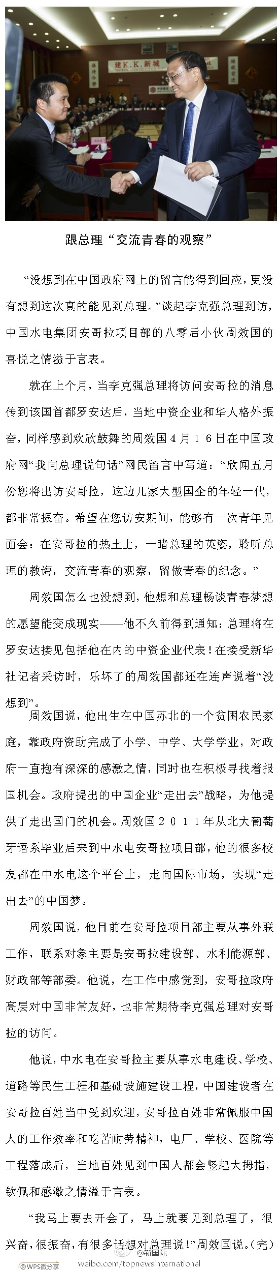 ??? 新華網(wǎng)北京5月9日電 據(jù)新華社“新國際”微博報(bào)道,80后的周效國2011年大學(xué)畢業(yè)后,被派往中水電安哥拉項(xiàng)目部工作。不久前獲知李總理將訪安,他在中國政府網(wǎng)給總理留言,希望與總理“交流青春的觀察”。8日,李克強(qiáng)在安主持召開海外民生座談會(huì),周效國夢(mèng)想成真,受邀參加并作了發(fā)言。詳情請(qǐng)戳長微。