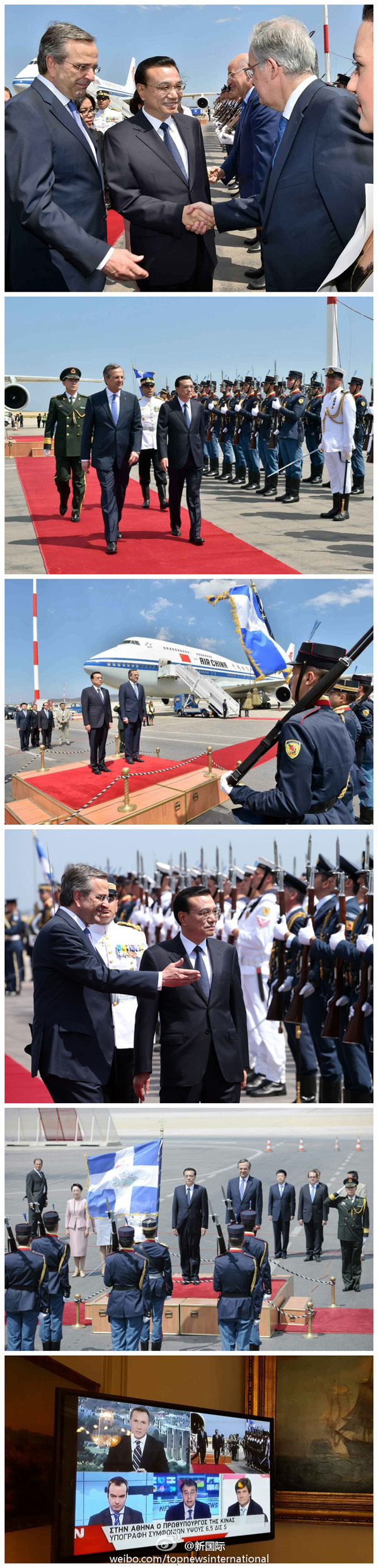 新華網(wǎng)北京6月20日電 據(jù)新華社“新國際”微博報(bào)道,李克強(qiáng)總理偕夫人程虹19日下午乘專機(jī)抵達(dá)雅典,開始對(duì)希臘的正式訪問,希臘總理薩馬拉斯和夫人到機(jī)場(chǎng)迎接?,F(xiàn)場(chǎng)奏響中希兩國國歌,李克強(qiáng)在薩馬拉斯陪同下檢閱了儀仗隊(duì)。希臘是西方文明發(fā)源地,這是李克強(qiáng)總理首次訪希,將推進(jìn)雙方海洋、文化等領(lǐng)域合作。