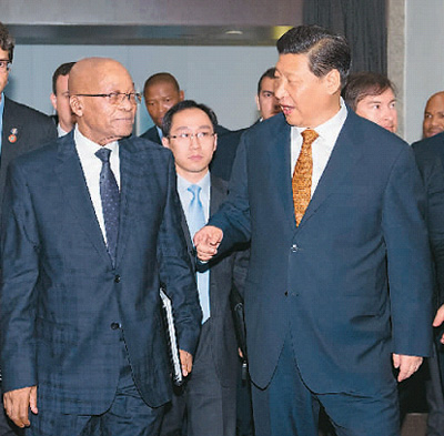 習(xí)近平表示,當(dāng)前,中南關(guān)系正面臨重要發(fā)展機(jī)遇期,合作潛力巨大,我們應(yīng)該乘勢(shì)而上,努力推動(dòng)中南關(guān)系再上新臺(tái)階。我歡迎祖馬總統(tǒng)下半年訪華,共同制定未來(lái)合作規(guī)劃。雙方要積極開展能源、礦業(yè)、農(nóng)業(yè)、裝備制造、基礎(chǔ)設(shè)施建設(shè)、鐵路機(jī)車、核電等領(lǐng)域合作,中方愿繼續(xù)配合南非辦好2014年中國(guó)南非年活動(dòng)。
