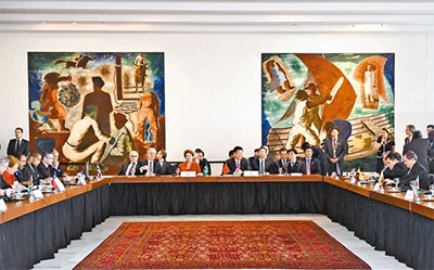 會(huì)晤開(kāi)始前,習(xí)近平與羅塞夫共同迎接出席會(huì)晤的拉美和加勒比國(guó)家領(lǐng)導(dǎo)人和代表,同他們一一握手并集體合影。