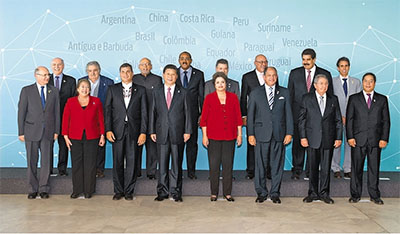 ? 當(dāng)?shù)貢r(shí)間7月17日下午,中國(guó)—拉美和加勒比國(guó)家領(lǐng)導(dǎo)人會(huì)晤在巴西利亞舉行。本次會(huì)晤由中方倡議,中國(guó)國(guó)家主席習(xí)近平、巴西總統(tǒng)羅塞夫、哥斯達(dá)黎加總統(tǒng)索利斯、古巴國(guó)務(wù)委員會(huì)主席兼部長(zhǎng)會(huì)議主席勞爾·卡斯特羅、厄瓜多爾總統(tǒng)科雷亞、蘇里南總統(tǒng)鮑特塞、哥倫比亞總統(tǒng)桑托斯、智利總統(tǒng)巴切萊特、圭亞那總統(tǒng)拉莫塔爾、烏拉圭總統(tǒng)穆???、委內(nèi)瑞拉總統(tǒng)馬杜羅、安提瓜和巴布達(dá)總理布朗等出席。