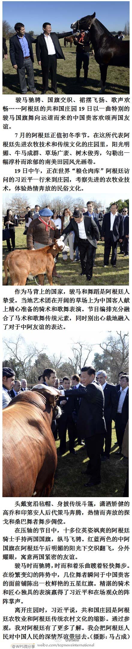 ??? 新華網(wǎng)北京7月20日電 據(jù)新華社“新國際”微博報道,駿馬馳騁、國旗交織、裙擺飛揚(yáng)、歌聲歡暢……阿根廷的共和國莊園19日以一曲特別的駿馬國旗舞向遠(yuǎn)道而來的中國貴客歡頌兩國友誼。