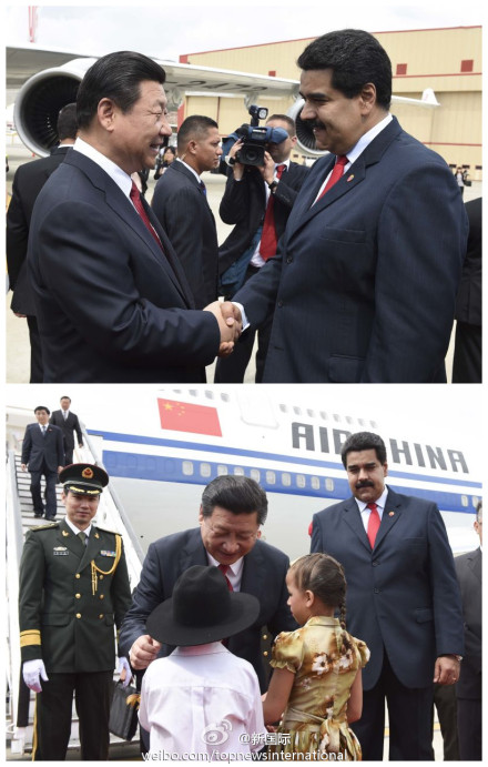 ????新華網(wǎng)北京7月21日電 據(jù)新華社“新國(guó)際”微博報(bào)道,經(jīng)過近7小時(shí)飛行,習(xí)近平主席當(dāng)?shù)貢r(shí)間20日下午飛抵加拉加斯。專機(jī)進(jìn)入委領(lǐng)空后,委空軍2架蘇-30戰(zhàn)機(jī)升空護(hù)航。馬杜羅總統(tǒng)親自到機(jī)場(chǎng)迎接。隨后,歡迎儀式在機(jī)場(chǎng)隆重舉行,習(xí)近平在馬杜羅陪同下檢閱儀仗隊(duì)。
