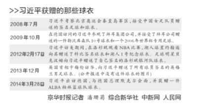 ????作為足球迷,能夠收獲著名球隊、球員的足球和球衣,恐怕是最讓別人羨慕的事兒了。習(xí)近平就曾經(jīng)收到球星貝克漢姆簽名的球衣、德甲勒沃庫森隊球衣、2006年世界杯專用足球等,也包括中國女子足球隊隊員簽名的足球。