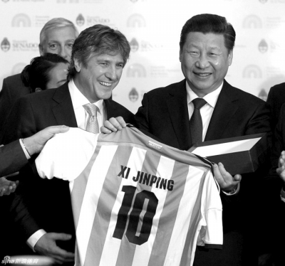 ????在和阿根廷副總統(tǒng)兼參議長布杜及眾議長多明格斯舉行會談時,習(xí)近平特別提到阿根廷足球隊在世界杯奪得亞軍,他說:“剛才眾議長先生問我是否喜歡足球,我說我非常喜歡足球。他也祝愿中國能夠早日舉辦一屆世界杯,這正是我的愿望。但是我們足球的發(fā)展,還希望同阿根廷加強交流合作,靠你們的幫助,提高我們的水平。”