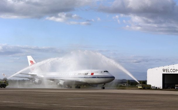 ????11月21日,習(xí)近平乘坐的專(zhuān)機(jī)在楠迪國(guó)際機(jī)場(chǎng)跑道上滑行穿過(guò)“水門(mén)”,這是當(dāng)?shù)亟o予最尊貴客人的禮遇,表達(dá)為客人“洗塵”。 (攝影 丁林)