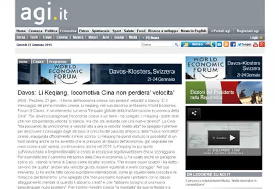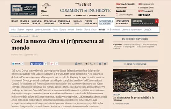意大利24小時(shí)太陽(yáng)報(bào)1月22日發(fā)表題為《中國(guó)重新向世界自我介紹》的評(píng)論性文章,介紹了李克強(qiáng)在世界經(jīng)濟(jì)論壇上的講話。文章稱,雖然國(guó)際社會(huì)一直在用西方國(guó)家的種族主義中心心態(tài)以及舊的眼光看待中國(guó),中國(guó)國(guó)務(wù)院總理李克強(qiáng)的長(zhǎng)期戰(zhàn)略眼光和他的新政策還是給達(dá)沃斯的聽(tīng)眾們留下深刻印象。