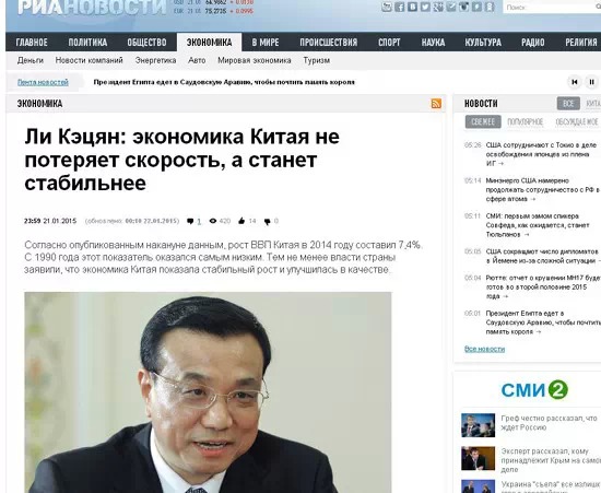 俄新社以一篇題為《中國(guó)經(jīng)濟(jì)不會(huì)失速,而會(huì)更加穩(wěn)定》的文章,報(bào)道了中國(guó)經(jīng)濟(jì)的發(fā)展前景。文中稱,2014年中國(guó)經(jīng)濟(jì)發(fā)展速度是7.4%,這是1990年以來(lái)的一個(gè)低點(diǎn),但中國(guó)經(jīng)濟(jì)的發(fā)展正在體現(xiàn)“新常態(tài)”,即體現(xiàn)在質(zhì)的提升。