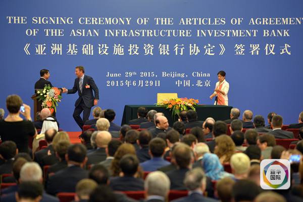 ????2015年6月29日,《亞洲基礎(chǔ)設(shè)施投資銀行協(xié)定》簽署儀式在北京舉行。當(dāng)日,英國授權(quán)代表(臺上中)在簽署《協(xié)定》后與儀式主持、財政部副部長史耀斌握手。