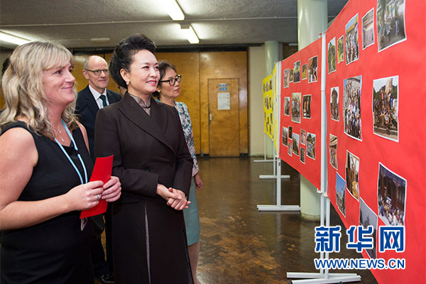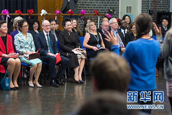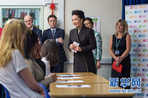 在英國(guó)教育部國(guó)務(wù)大臣吉布、學(xué)校校長(zhǎng)等陪同下,彭麗媛觀看學(xué)生們用中文進(jìn)行的才藝表演,參觀學(xué)校成果展,觀摩中文課,與女學(xué)生們互動(dòng)交流,并向?qū)W校贈(zèng)送中國(guó)文化及漢語(yǔ)學(xué)習(xí)類圖書及音像制品。
