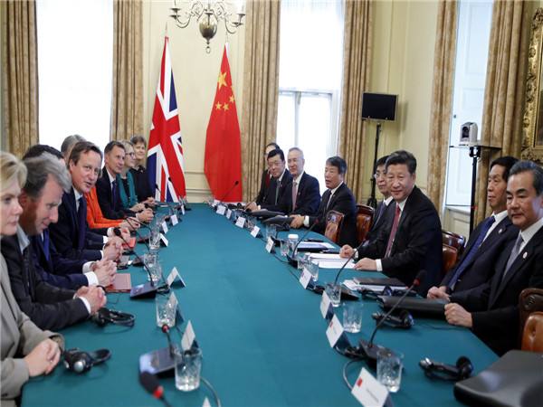 習(xí)近平說:“中英關(guān)系和中歐關(guān)系發(fā)展面臨繼往開來的重要機(jī)遇。英國是歐盟重要成員國,中英關(guān)系同中歐關(guān)系相輔相成?!?/p>