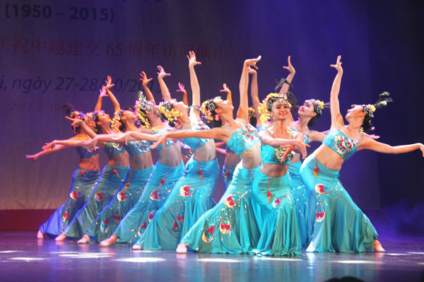 2015年10月27日,中國云南省藝術(shù)團在越南首都河內(nèi)表演傣族舞蹈《美的祝福》,慶祝中越建交65周年。