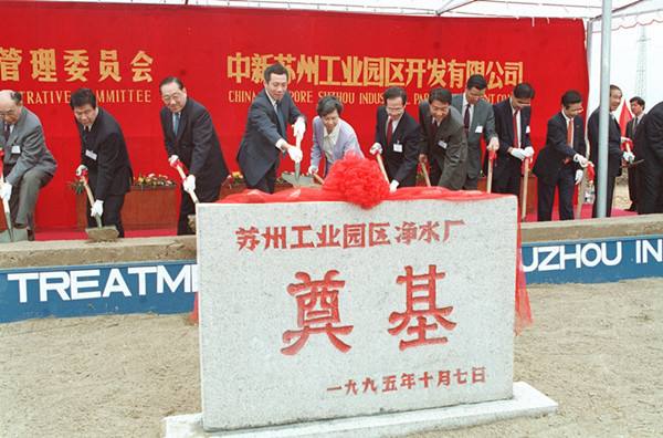 為了加快蘇州工業(yè)園區(qū)的建設,中新兩國政府聯(lián)合協(xié)調(diào)理事會第二次會議1995年10月7日在江蘇蘇州舉行。新加坡副總理李顯龍、中國副總理李嵐清主持了這次會議。圖為1995年10月7日會議代表參加蘇州凈水廠的奠基儀式,左三為李嵐清,左四為李顯龍。