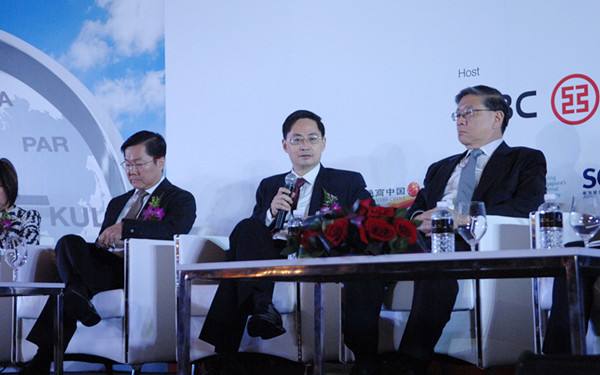 圖為2014年9月22日,中國人民銀行首席經(jīng)濟學家馬駿(中)在工行新加坡分行舉辦的人民幣國際化峰會上分享看法。當日,中新兩國金融及其他企業(yè)界人士、政府官員等數(shù)百人參加了舉行的人民幣國際化峰會,共同討論人民幣國際化的前景和路徑。