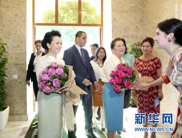 當?shù)貢r間6月22日下午,國家主席習(xí)近平夫人彭麗媛同烏茲別克斯坦總統(tǒng)卡里莫夫夫人卡里莫娃共同參觀塔什干孔子學(xué)院。這是孔子學(xué)院學(xué)生向彭麗媛和卡里莫娃獻花。新華社記者丁林攝