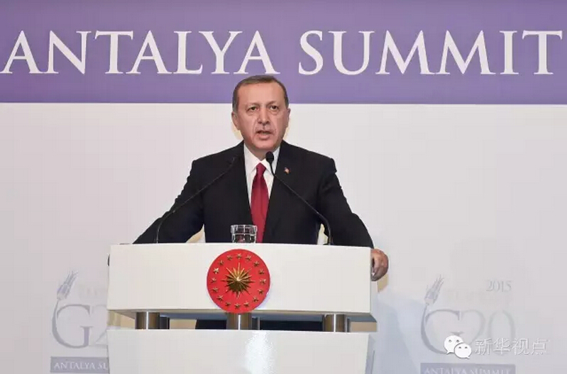 ??? 2015年11月,G20峰會在土耳其安塔利亞舉行,從安塔利亞到杭州,從地中海岸到錢塘江畔,與東道主接力棒一樣順利傳遞的,是對推動全球經(jīng)濟穩(wěn)步復(fù)蘇、實現(xiàn)可持續(xù)增長的決心?!敖影簟焙蟮闹袊?,在議題設(shè)置上既汲取了安塔利亞峰會的智慧成果,又著眼當(dāng)前、旨在長遠(yuǎn)、彰顯新意。 2015年G20安塔利亞峰會上的埃爾多安總統(tǒng)↓
