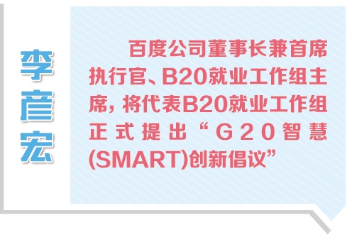 就業(yè)是B20的重點議題之一,也是當今世界面臨的重要問題之一。如何創(chuàng)造更加充分、更高質(zhì)量的就業(yè)機會,推動實現(xiàn)經(jīng)濟的持續(xù)和平衡增長,是各國面臨的重要任務。根據(jù)G20杭州峰會的“創(chuàng)新增長方式”議題,B20就業(yè)工作組主席、百度公司董事長兼首席執(zhí)行官李彥宏代表B20就業(yè)工作組提出了“G20智慧(SMART)創(chuàng)新倡議”。這一倡議得到了二十國集團工商界、商協(xié)會、國際機構和智庫代表的廣泛認可。