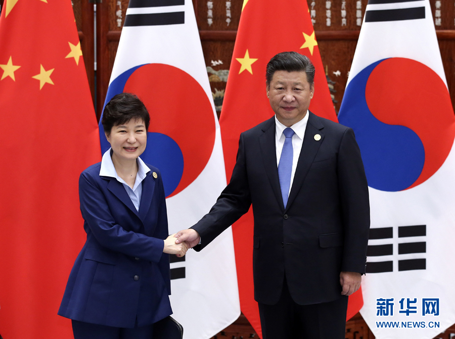 9月5日,國家主席習近平在杭州會見來華出席二十國集團領導人峰會的韓國總統(tǒng)樸槿惠。 新華社記者張鐸攝