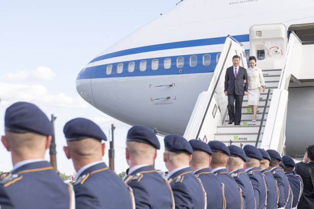 專機(jī)進(jìn)入德國領(lǐng)空,兩架德國空軍戰(zhàn)機(jī)升空護(hù)航。專機(jī)抵達(dá)柏林,習(xí)近平主席和夫人彭麗媛步出艙門,現(xiàn)場鳴21響禮炮,戰(zhàn)機(jī)在空中飛越致意。