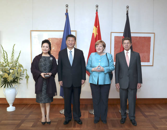 當(dāng)?shù)貢r間7月4日晚,剛剛抵達(dá)柏林的國家主席習(xí)近平在利伯曼故居同德國總理默克爾舉行會見。這是習(xí)近平和夫人彭麗媛抵達(dá)位于柏林市中心勃蘭登堡門附近的利伯曼故居時,受到默克爾和丈夫紹爾熱情迎接。(新華社記者馬占成攝)