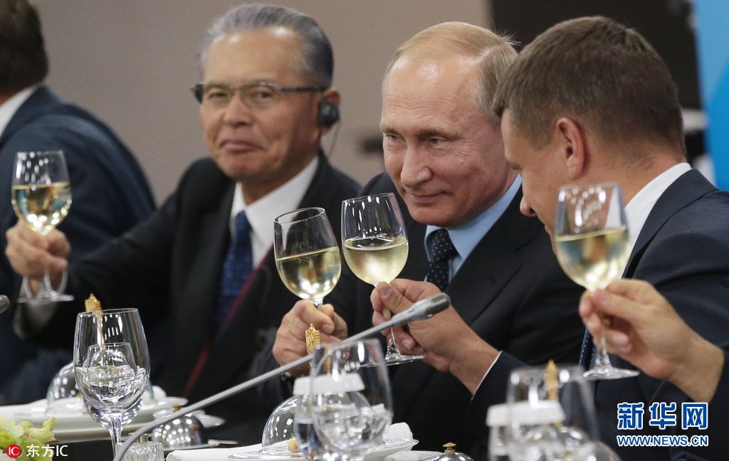 當(dāng)?shù)貢r(shí)間2017年9月6日,俄羅斯符拉迪沃斯托克,俄羅斯總統(tǒng)普京在遠(yuǎn)東聯(lián)邦大學(xué)會(huì)晤出席2017東方經(jīng)濟(jì)論壇的外商。(圖片來(lái)源:東方IC)