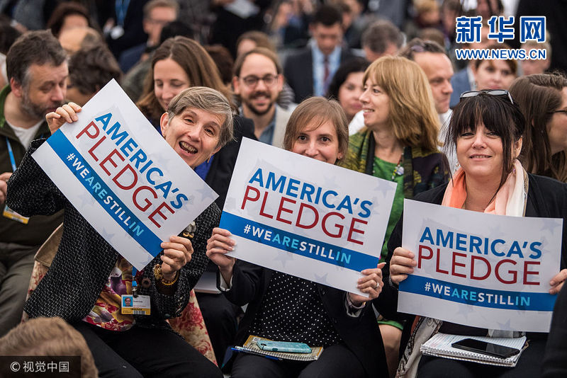 當(dāng)?shù)貢r(shí)間2017年11月11日,德國波恩,波恩氣候大會(huì)召開,“美國會(huì)館”內(nèi)景。雖然美國宣布退出了《巴黎協(xié)定》,但美國氣候談判代表仍出席了波恩的會(huì)議。美國除聯(lián)邦外的各級(jí)政府均派代表參加波恩會(huì)議,且主要目的就是表明他們?nèi)詫⒅铝τ趦冬F(xiàn)美國在巴黎做出的承諾。在美國國內(nèi),成千上萬的市長(zhǎng)、州長(zhǎng)、部落首領(lǐng)、企業(yè)高管以及普通美國人都在努力降低溫室氣體排放。這個(gè)名為“我們?nèi)栽趫?jiān)守(We Are Still In)”的聯(lián)盟的成員代表了美國一半以上的人口以及54%的經(jīng)濟(jì)產(chǎn)出?!拔覀?nèi)栽趫?jiān)守”( We Are Still In)、“美國氣候聯(lián)盟”、“氣候市長(zhǎng)”(Climate Mayors)和其它諸多計(jì)劃向全世界傳遞了這樣一個(gè)信息,即美國仍然有很多人正致力于擁有宏偉目標(biāo)的氣候行動(dòng)之中,而“美國的承諾”(America’s Pledge)正在尋求如何量化并傳播這些承諾。(圖片來源:視覺中國)