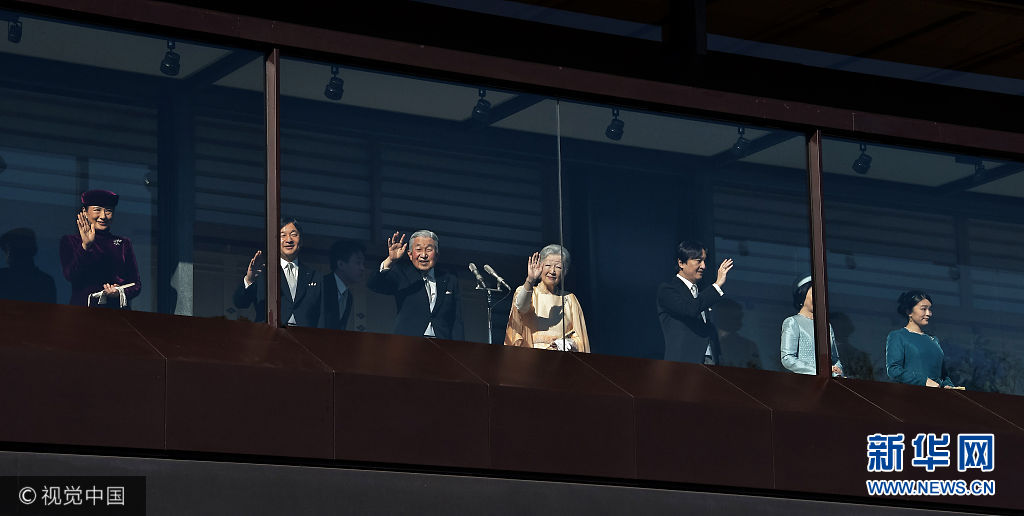 當(dāng)?shù)貢r(shí)間2017年12月23日,日本東京,日本明仁天皇慶祝84歲生日,在皇宮的陽(yáng)臺(tái)上向祝福者揮手致意。(圖片來(lái)源:視覺(jué)中國(guó))