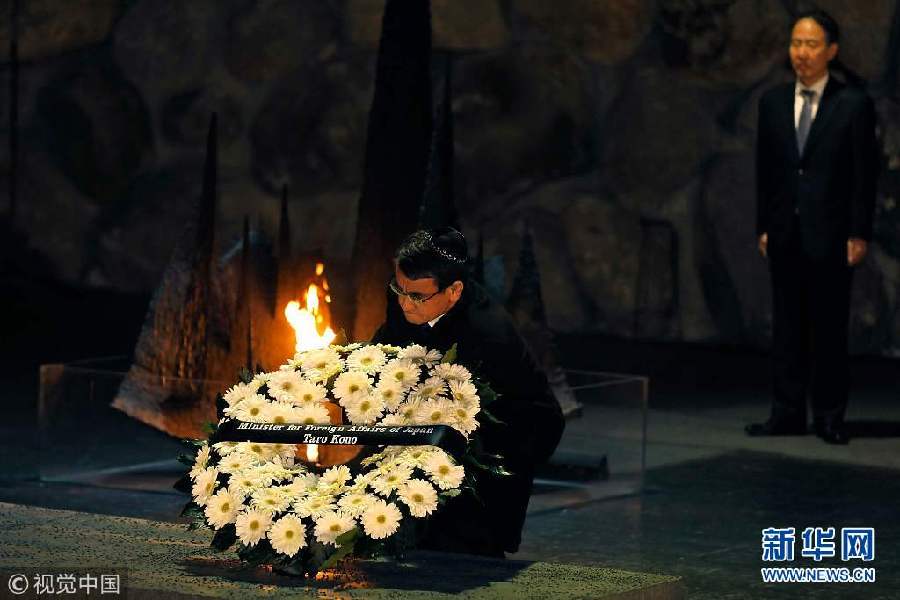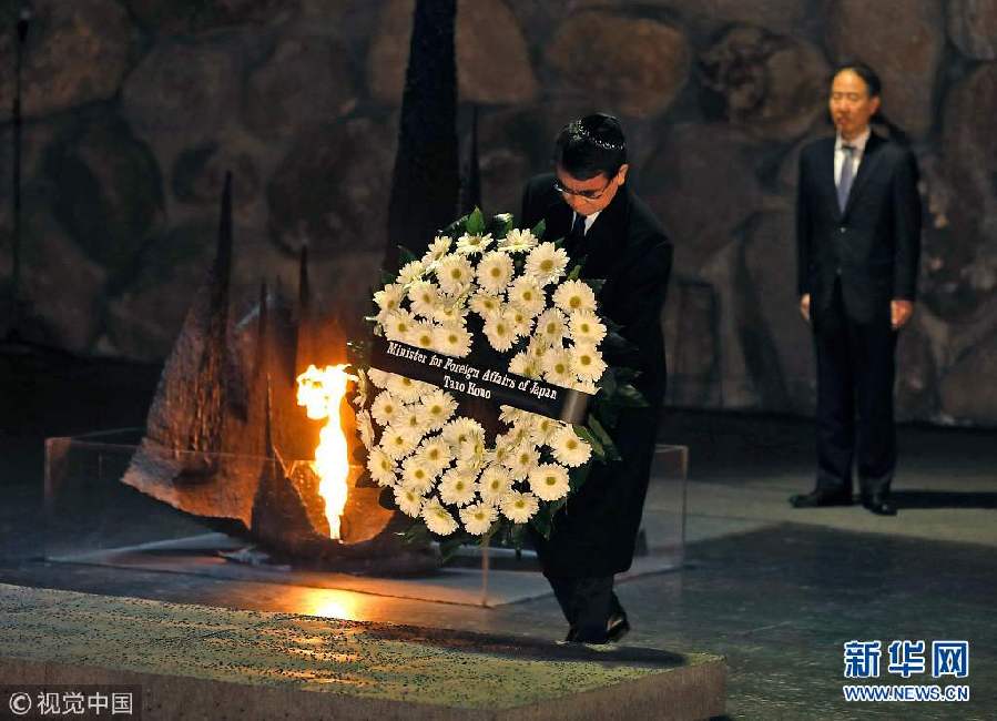 12月25日,耶路撒冷,日本外相河野太郎訪問(wèn)耶路撒冷,參觀大屠殺紀(jì)念館,獻(xiàn)花悼念死難者。(圖片來(lái)源:視覺(jué)中國(guó))