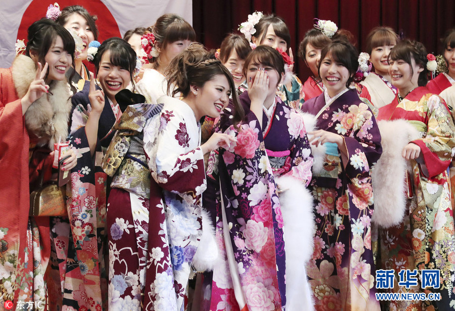 ? 1月7日,日本福岡縣北九州市,日本多地舉辦“成人節(jié)”慶祝儀式,少女們身穿和服盛裝出席。(圖片來源:東方IC)