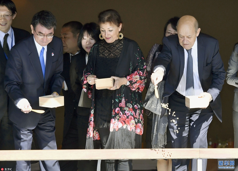 當(dāng)?shù)貢r間2018年1月27日,日本東京,日本外相河野太郎接待到訪的法國外長讓·伊夫·勒德里昂及其夫人,帶其參觀赤坂宮,體驗喂魚。(圖片來源:東方ic)