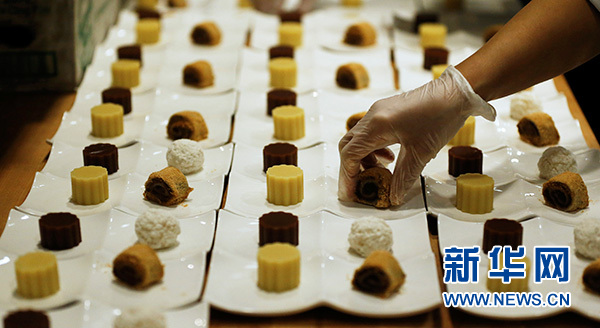 2月8日,在美國洛杉磯,廚師準(zhǔn)備傳統(tǒng)中式點(diǎn)心“驢打滾”、“艾窩窩”、“豌豆黃”和“紅豆涼糕”。 新華社記者 李穎 攝