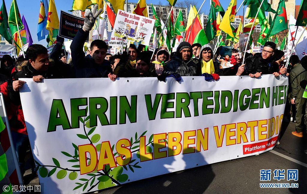 當?shù)貢r間2018年3月3日,德國柏林,當?shù)孛癖娕e行游行,抗議土耳其對敘利亞阿夫林地區(qū)的庫爾德人采取軍事行動。(圖片來源:視覺中國)