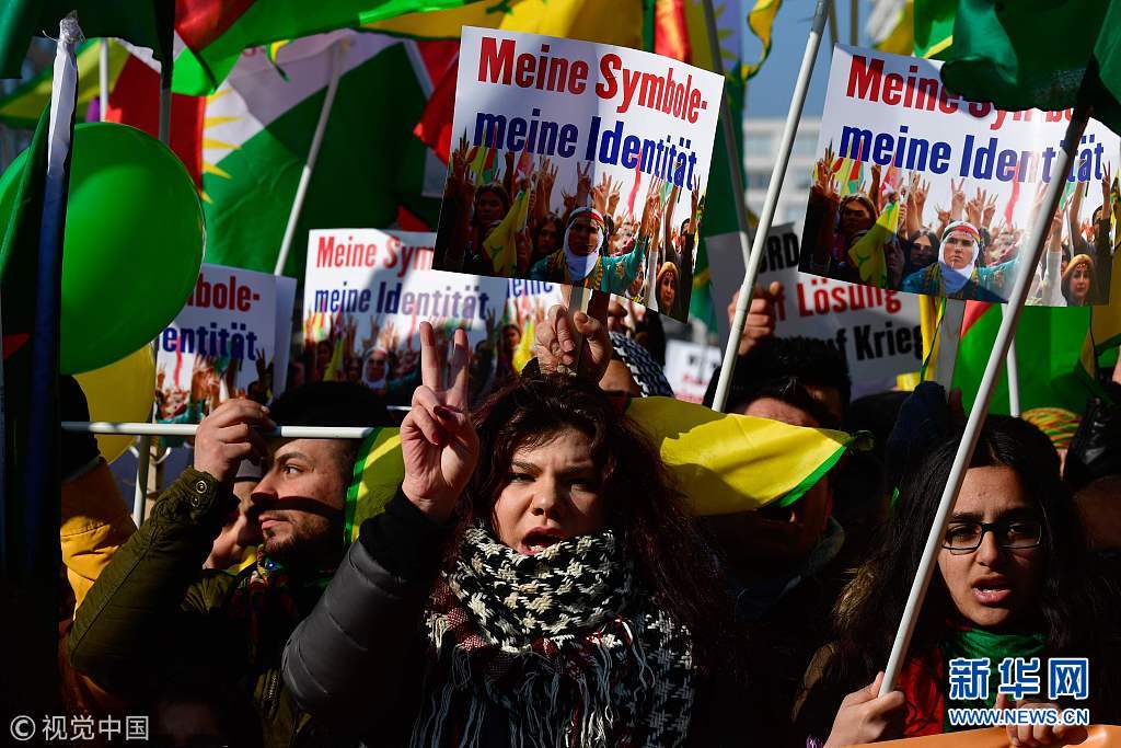 當(dāng)?shù)貢r(shí)間2018年3月3日,德國柏林,當(dāng)?shù)孛癖娕e行游行,抗議土耳其對敘利亞阿夫林地區(qū)的庫爾德人采取軍事行動。(圖片來源:視覺中國)