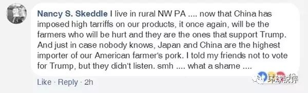 ?。ň幷咦ⅲ何易≡谫e州西北部農(nóng)村…中國準(zhǔn)備對我們的產(chǎn)品加征關(guān)稅,曾支持特朗普的農(nóng)民會(huì)再次受傷……我告訴過我的朋友不要給特朗普投票,但他們不聽。哎,太無語了……)