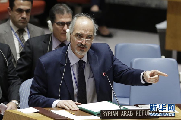 資料圖:2月24日,在位于紐約的聯(lián)合國總部,敘利亞常駐聯(lián)合國代表賈法里(前)在安理會(huì)通過敘利亞全境停火決議草案后發(fā)言。新華網(wǎng)記者 李木子 攝
