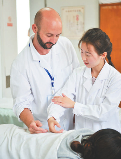 2017年7月,11名西班牙“洋中醫(yī)”來到位于昆明市的云南省中醫(yī)院學(xué)習(xí)推拿和針灸。圖為中國老師指導(dǎo)“洋中醫(yī)”。人民視覺